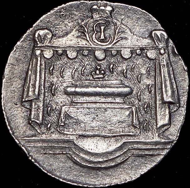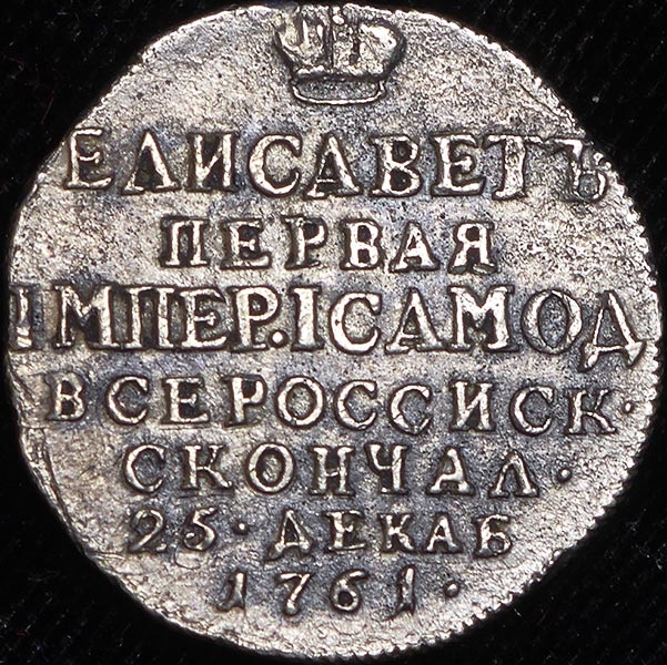 На аверсе под императорской короной надпись в 7 строк "ЕЛИСАВЕТЪ ПЕРВАЯ IМПЕР.I САМОД ВСЕРОССИСК. СКОНЧАЛ. 25.ДЕКАБ. 1761".