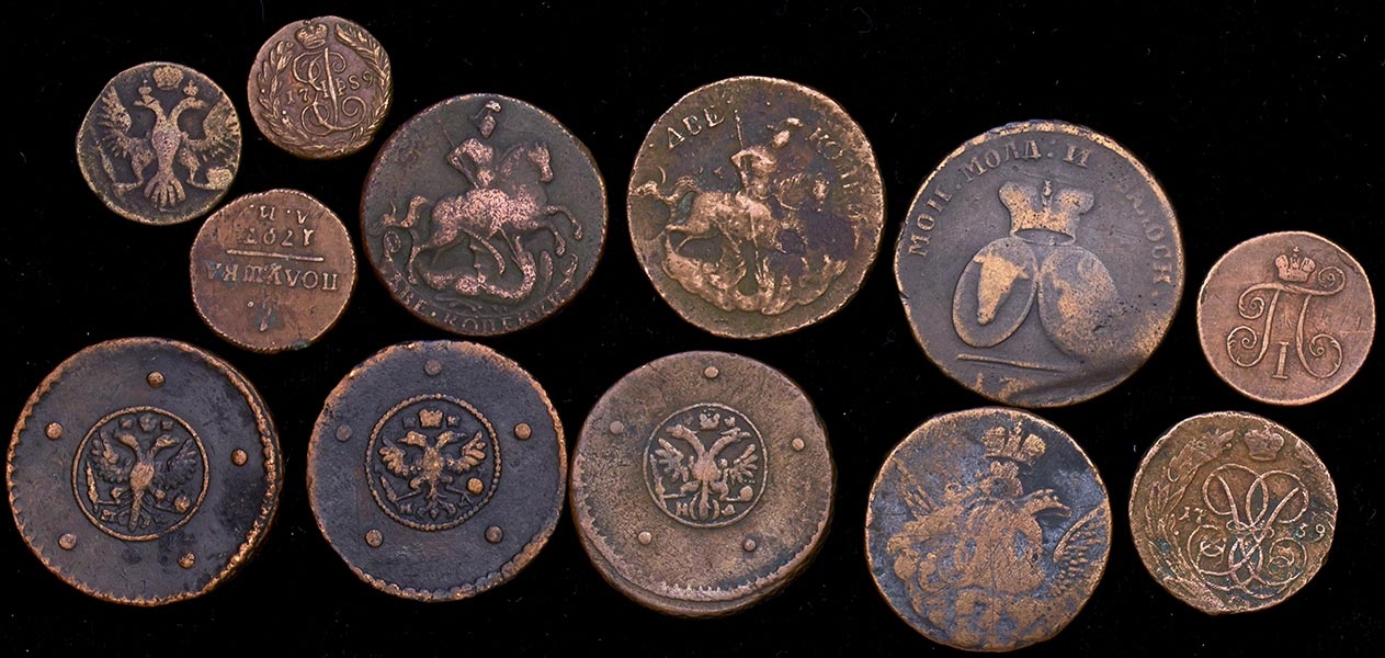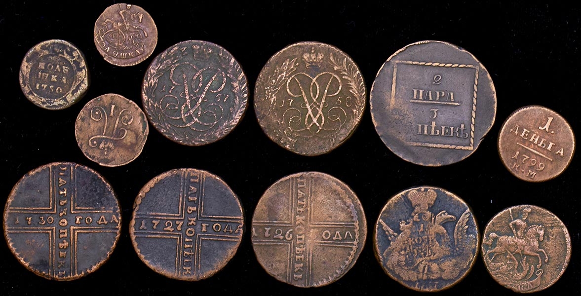 В т.ч. "крестовые" пятаки, "облачная" копейка, молдаво-валахские 2 пара - 3 копейки и др.