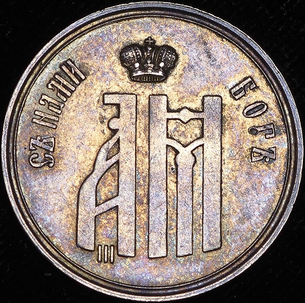 Чеканен по случаю коронации Александра III и Марии Федоровны. Гравер А. Грилихес-отец.
