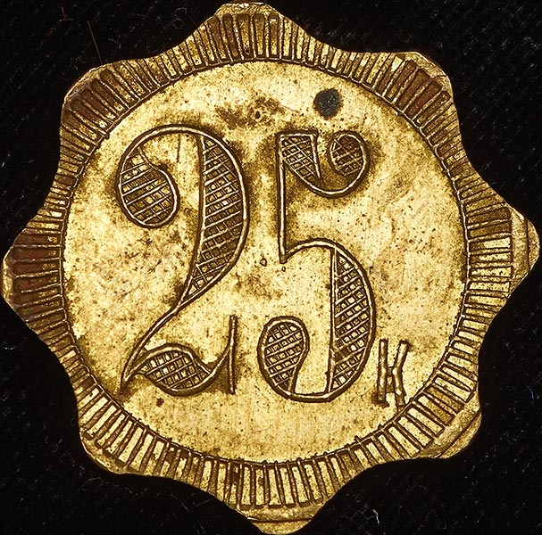 Платежный жетон 25 копеек чердынского купца II гильдии Тимохова Филиппа Ефимовича.