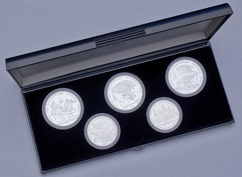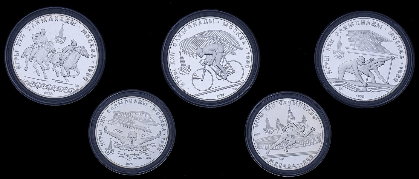 Набор из 5-ти серебряных монет 1978 года, выпущенных по случаю XXII олимпийских игр в Москве.