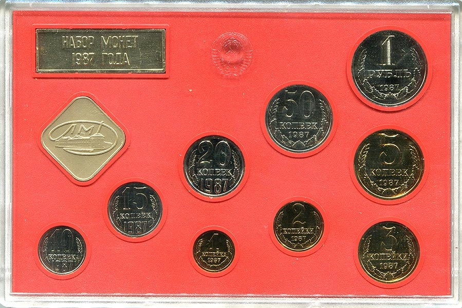 Годовой набор монет СССР 1987 года Ленинградского монетного двора с жетоном и годовой плашкой.