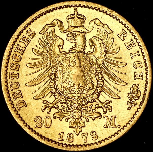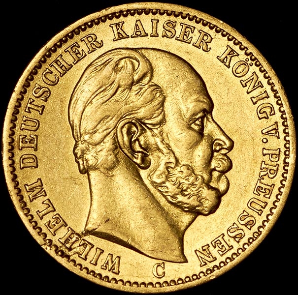 Первая монета с номиналом в 20 марок была выпущена в 1871 году, на первом году царствования Вильгельма І как Германского Императора и десятом году в качестве прусского правителя.