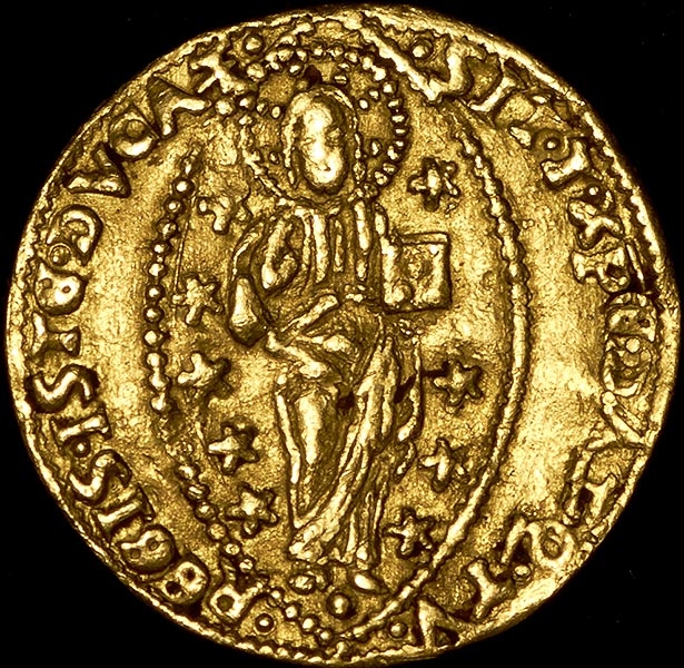 На аверсе монеты был изображён Христос, на реверсе — коленопреклонённый дож, принимающий из рук святого Марка знамя. Круговая легенда на аверсе гласила: SIT TIBI CHRISTE DATUS, QUEM TU REGIS ISTE DUCATUS («Это герцогство, коим ты правишь, тебе, Христос, посвящается»). От последнего слова легенды произошло обиходное название монеты — дукат.