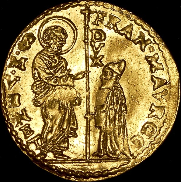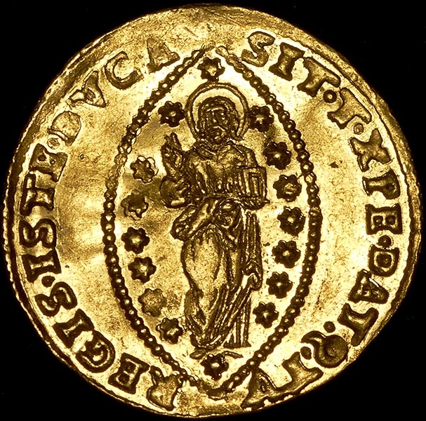 На аверсе монеты был изображён Христос, на реверсе — коленопреклонённый дож, принимающий из рук святого Марка знамя. Круговая легенда на аверсе гласила: SIT TIBI CHRISTE DATUS, QUEM TU REGIS ISTE DUCATUS («Это герцогство, коим ты правишь, тебе, Христос, посвящается»). От последнего слова легенды произошло обиходное название монеты — дукат.