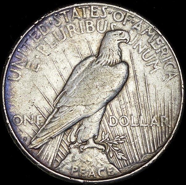 Первоначально Антонио де Франчиски планировал поместить на реверсе белоголового орлана — геральдический символ США, держащего в когтях разломанный меч. Однако такое изображение могло символизировать также и поражение. В связи с этим гравёр Морган заменил меч на оливковую ветвь, которая сама по себе символизирует мир. Орёл сидит на скале, на которой находится надпись «PEACE». Благодаря ей, монета получила своё название «мирного доллара».