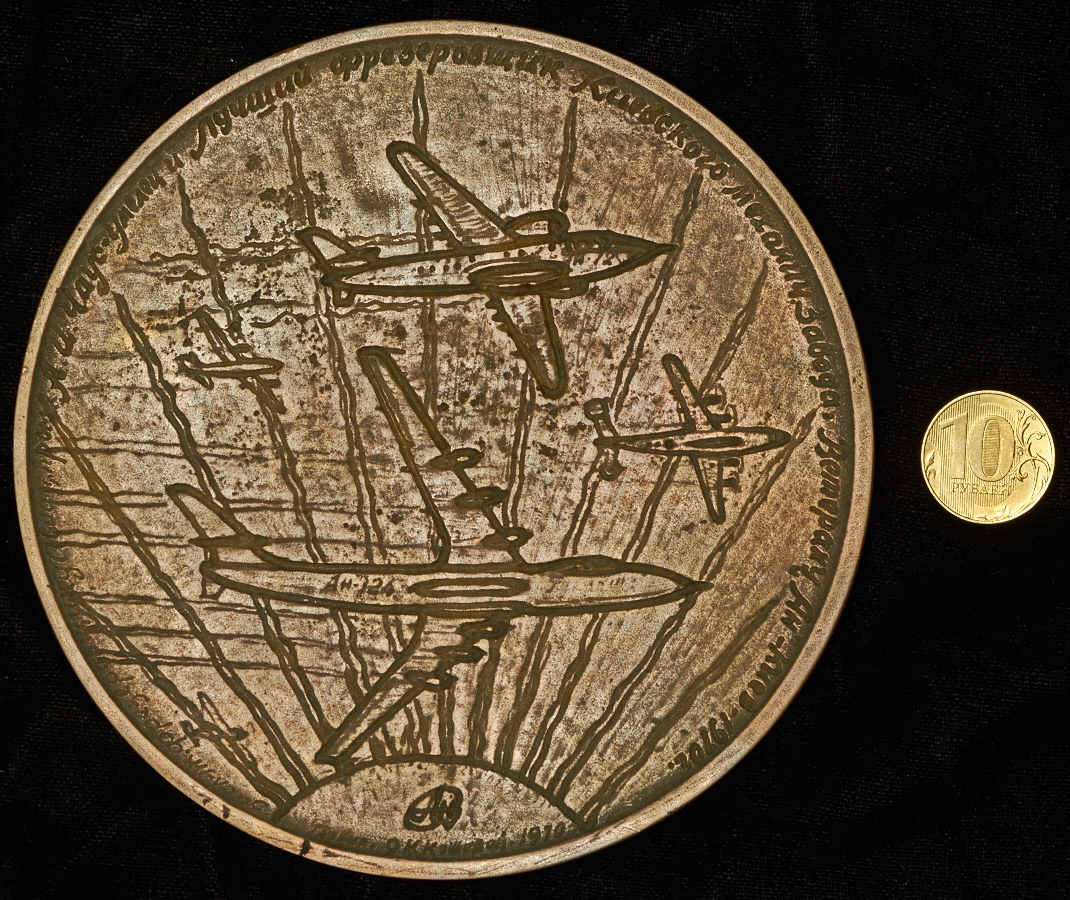 Лицевая сторона: «Александр Иванович Чаус 50 лет от КМЗ «АН».
