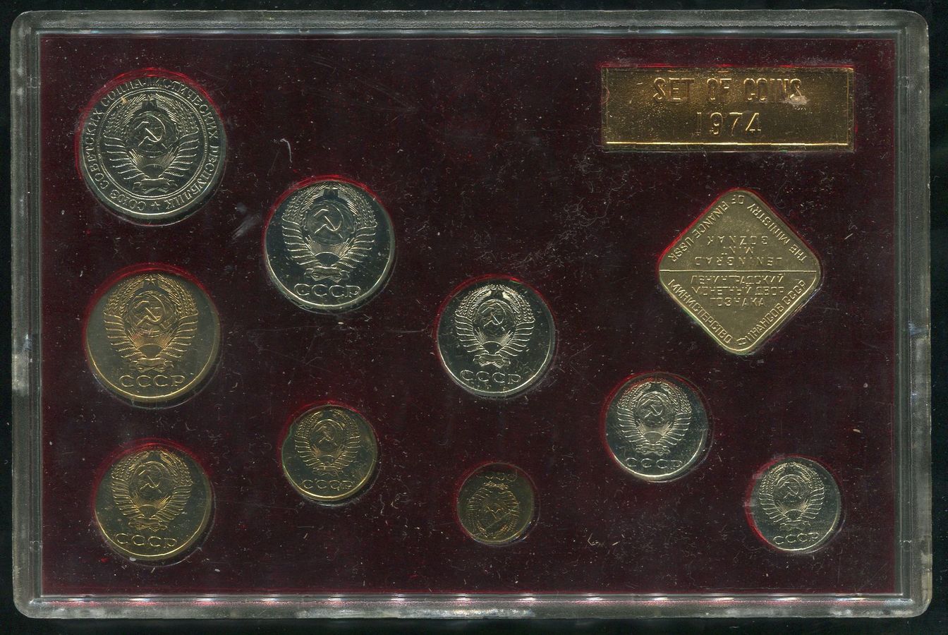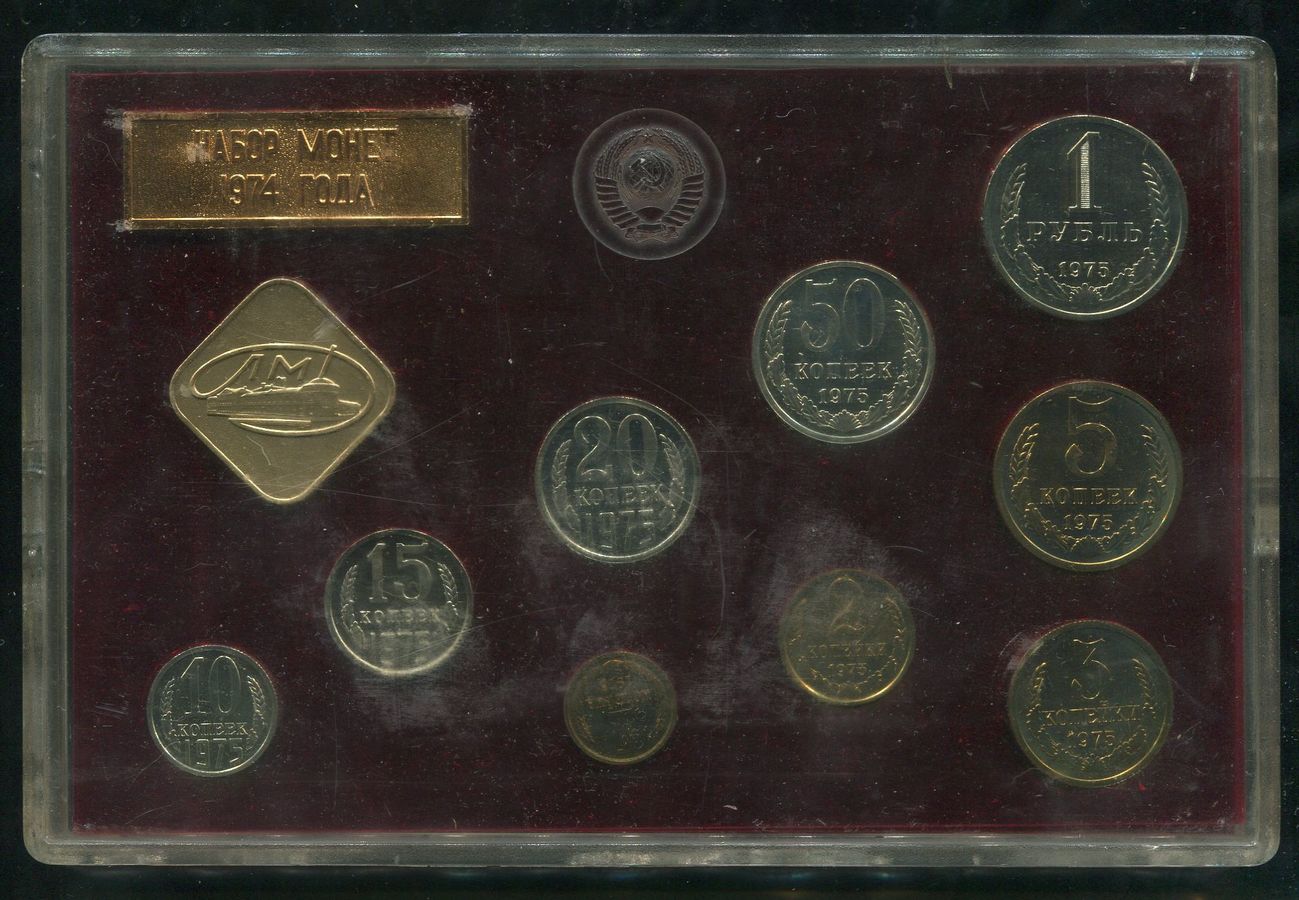 Вероятно, был вскрыт годовой набор 1974 года с красным прозрачным держателем, вместо монет 1974 года вставлены монеты 1975 года, но шильдик оставлен от 1974 года. После коробку заклеили.