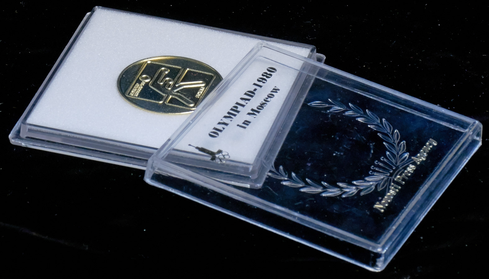 В оригинальной подарочной коробочке с надписями "OLYMPIAD-1980 in Moscow", "Novosti Press Agency".