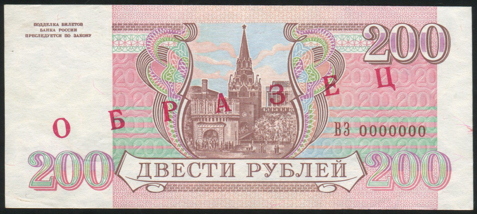 Образец Билета Банка России 200 рублей 1993 года, ВЗ 0000000.