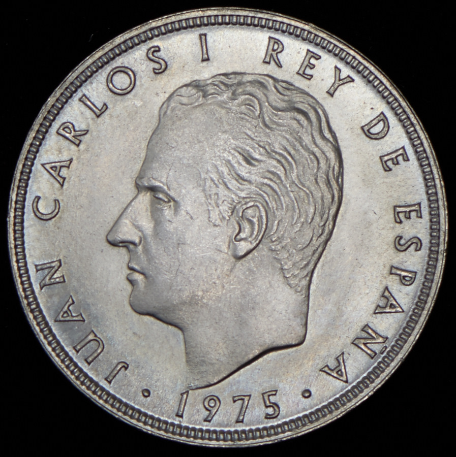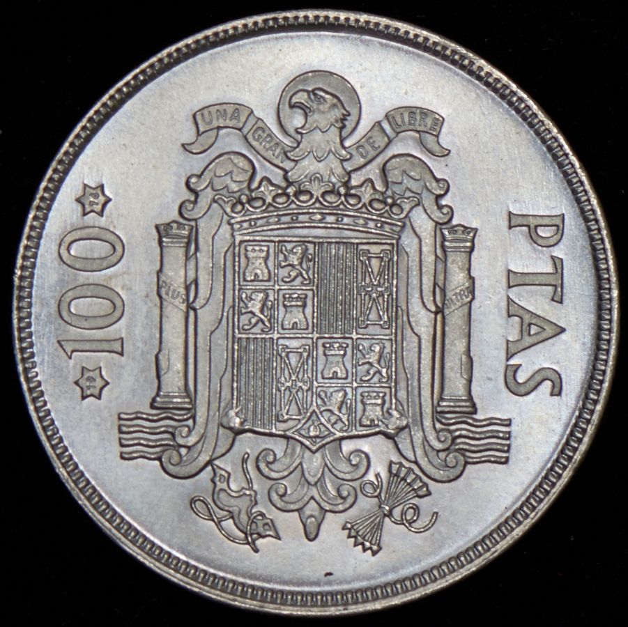 KM# 810.Большая часть тиража изьята. Хуан Карлос - р. Герб Испании при режиме Ф. Франко)