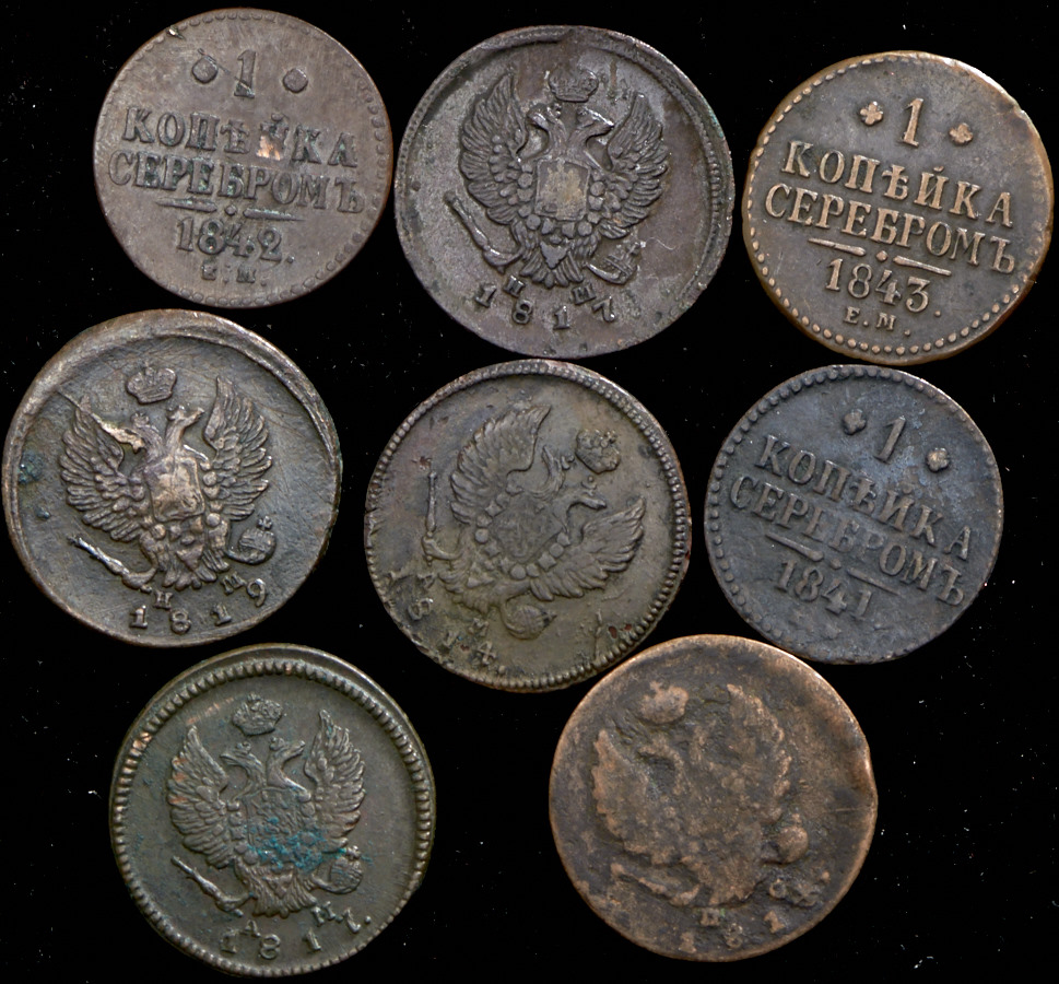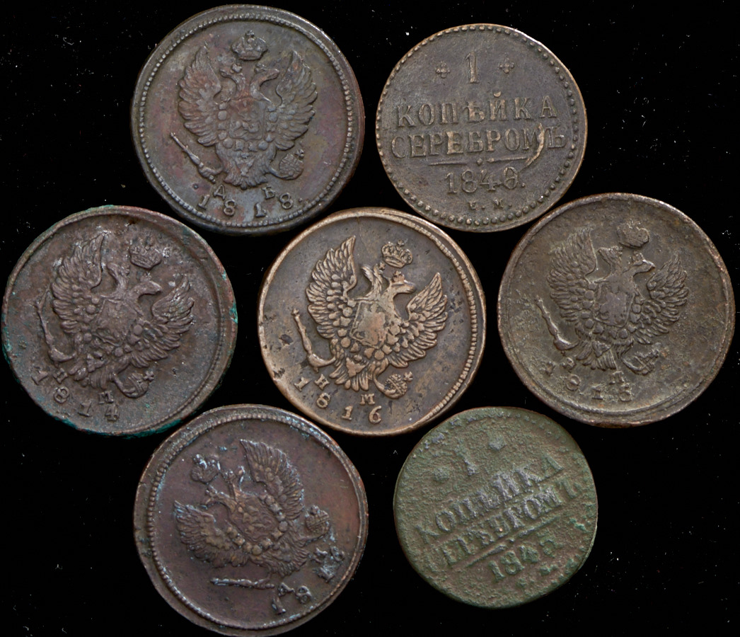 В набор вошли монеты номиналом 1 и 2 копейки первой половины XIX в. G-XF