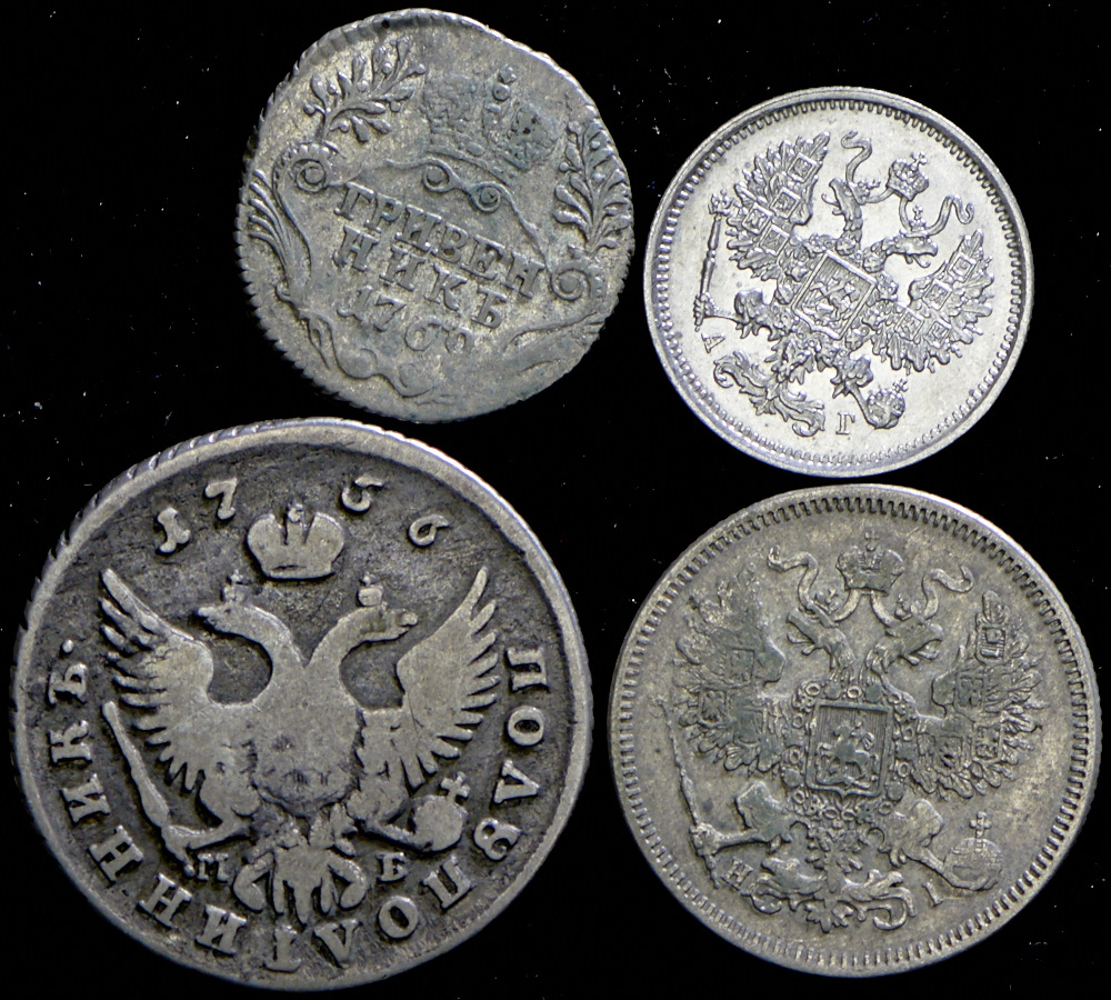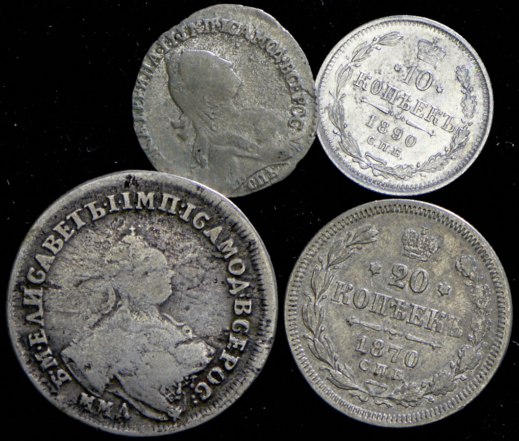 Полуполтинник 1756, гривенник 1769, 20 копеек 1870, 10 копеек 1890.