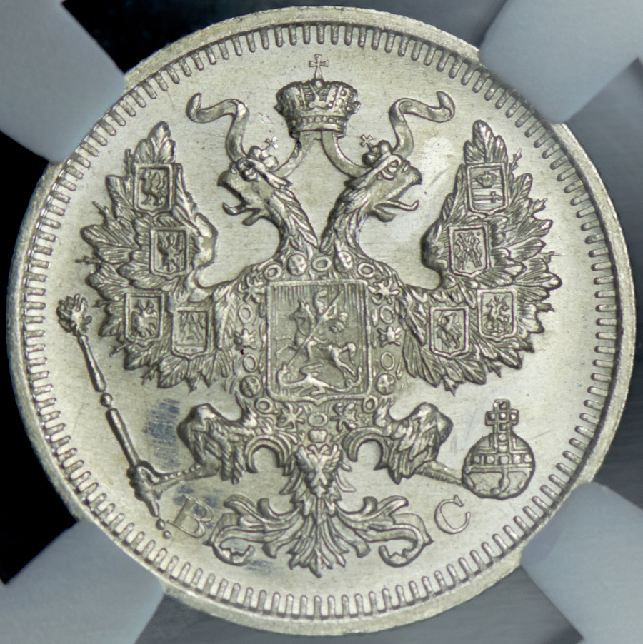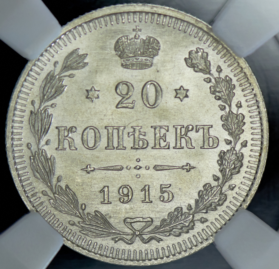 "После начала первой мировой войны, в которой противником России была германия, русской столице в 1915 г. вместо "немецкого" названия - Санкт-Петербург - было присвоено русское - Петроград. В связи с этим со всех русских монет (разменных серебряных и медных) было снято обозначение Петербургского монетного двора - "СПБ" (т.е. "Санкт-Петербург"), однако другого обозначения до 1917 г. так и не было установлено."
