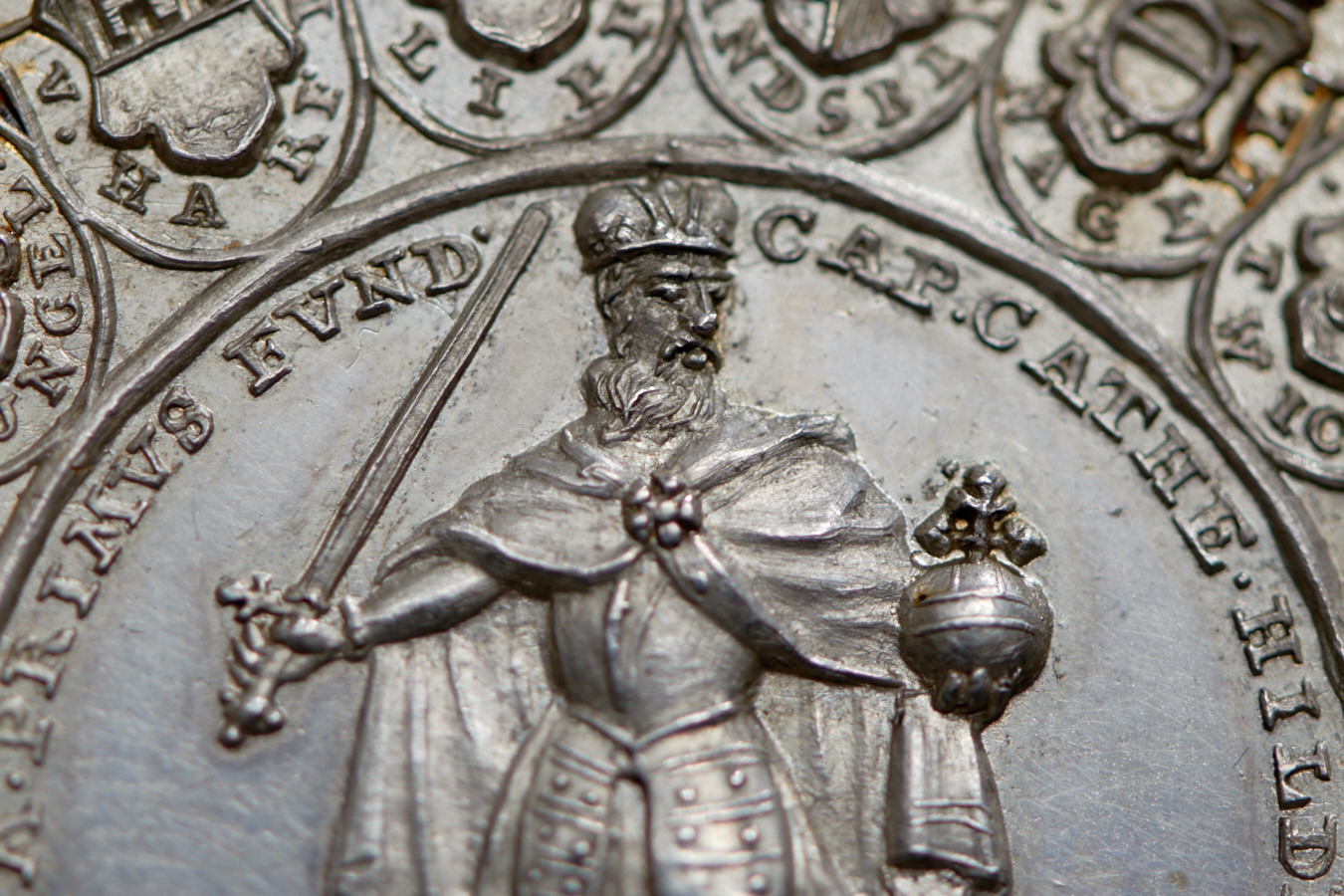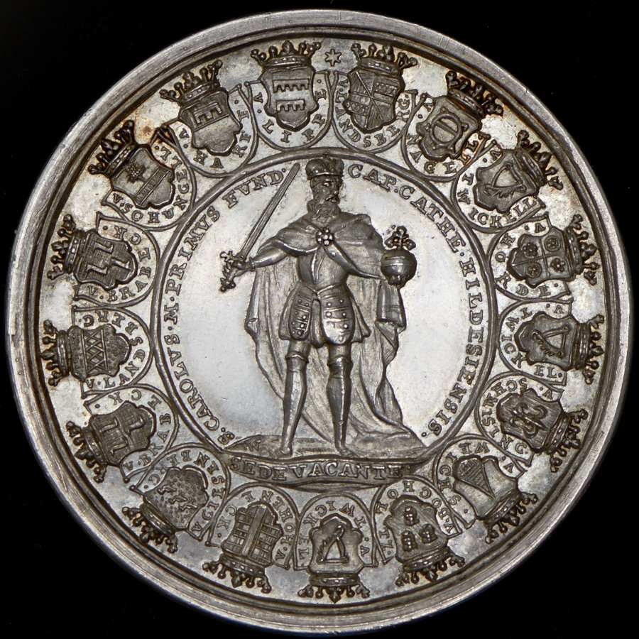 На одной стороне изображен Карл Великий с мечом и державой, под ним "SEDE VACANTE", круговая легенда ", S. CAROLVS. M. PRIMVS FVND. CAP. CATHE. HILDESIENSIS.", по краю 17 гербов.