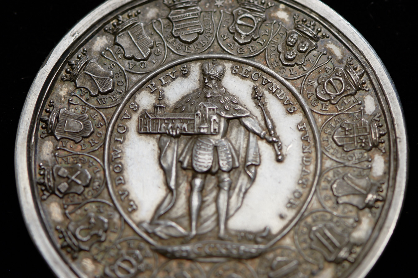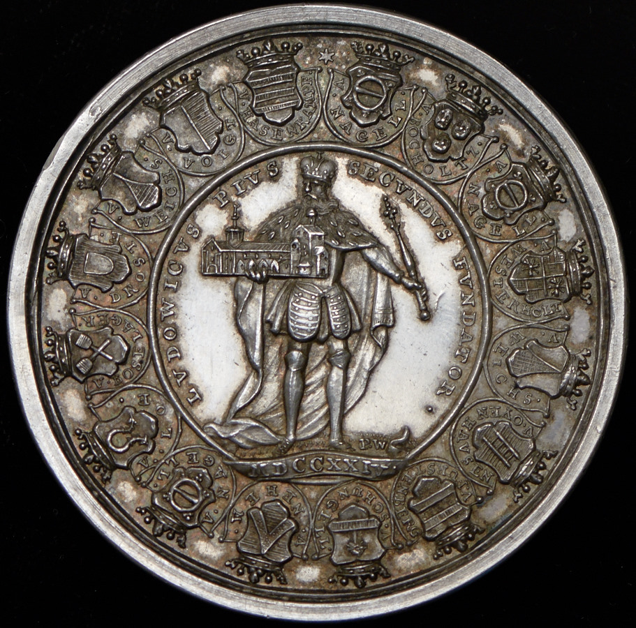 На другой стороне изображен Людовик I Благочестивый (Louis the Pious), со скипетром и моделью собора в руке, под ним "MDCCXXIV", курговая легенда "LVDOWICVS PIVS SECVNDVS FVNDATOR", по краю 16 гербов.