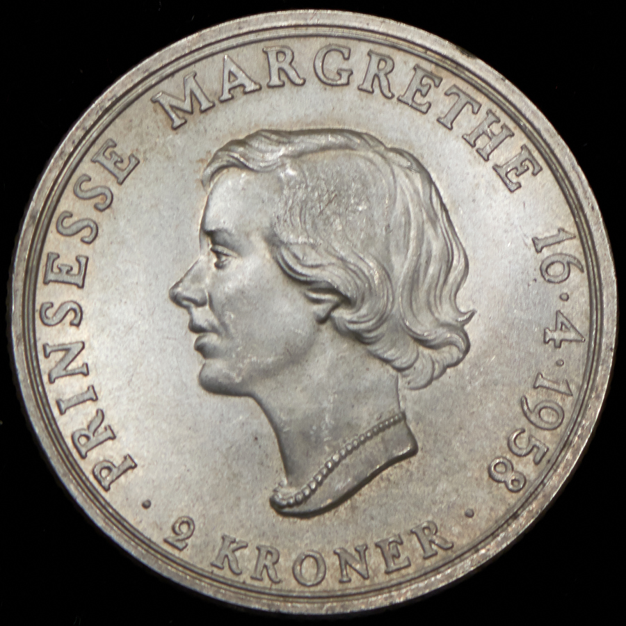 2 кроны 1958 "18 лет принцессе Маргрете" (Дания)
