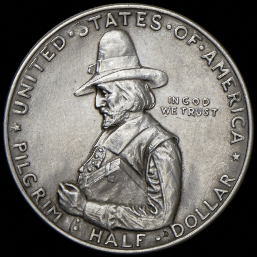 Монетный двор в Фаладельфии. Данная серебряная монета посвящена 300-летию прибытию Отцов-пилигримов. Отцы-пилигримы — первые поселенцев, прибывшие для создания новой колонии в Северной Америке. Плимутская колония (в настоящее время Плимут, штат Массачусетс), основанная в 1620 году, стала первым английским поселением с постоянным населением и первым крупным поселением в Новой Англии, вторым успешным английским поселением (после основанного в 1607 году Джеймстауна в Виргинии) на территории современных США.