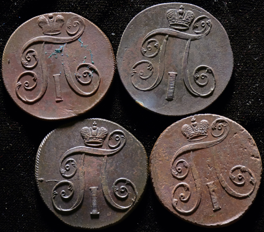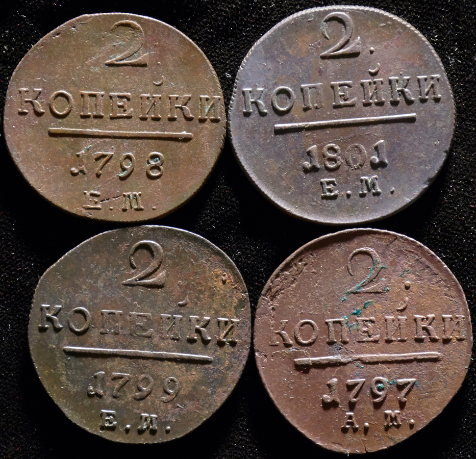 В набор вошли 2 копейки 1799 ЕМ, 1798 ЕМ, 1797 АМ, 1801 ЕМ гг.