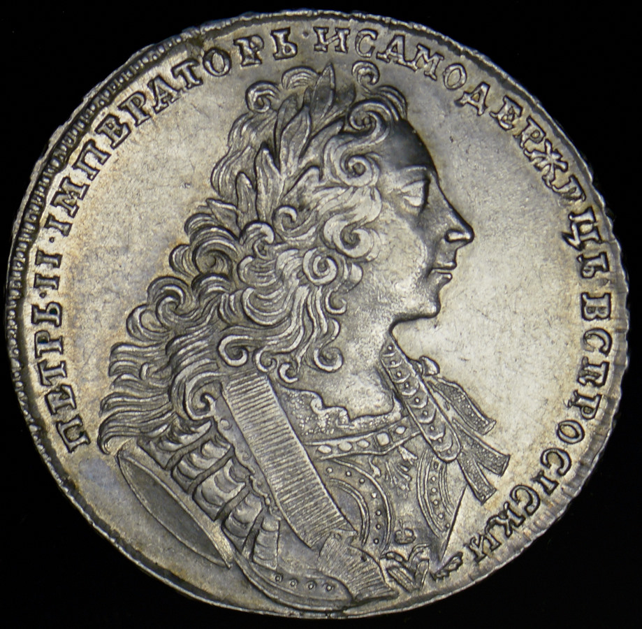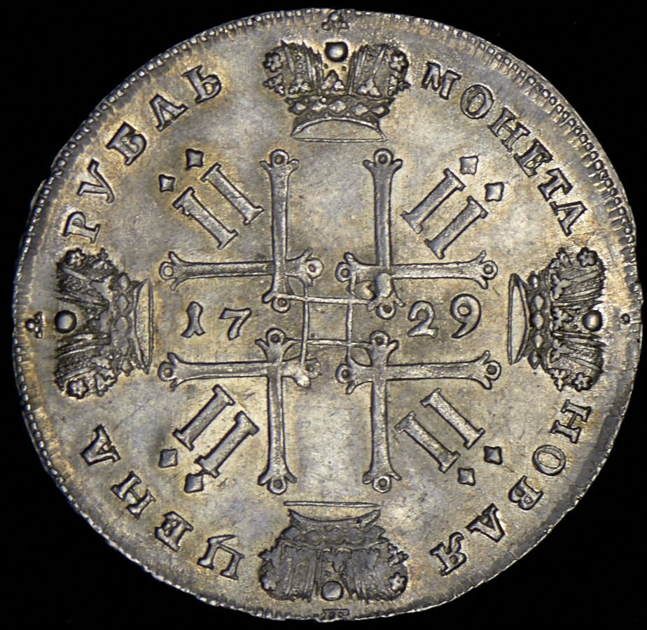 Кадашевский монетный двор. Тип 1729 года, портрет с орденской лентой, т.н. "Лисий нос".