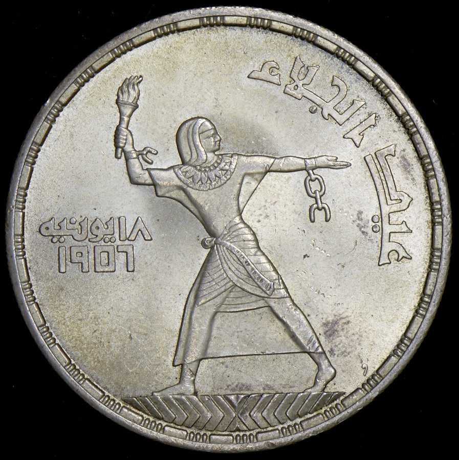 Эта серебряная монета чеканена в честь окончания 20-летнего срока действия Англо-Египетского договора подписанного в Лондоне 26 августа 1936 года и эвакуации британских войск из Египта. Единственный год чекана монеты данного типа. Дата на монете указана в лунной хиджре и соответствует 1956 году в григорианском летоисчислении.