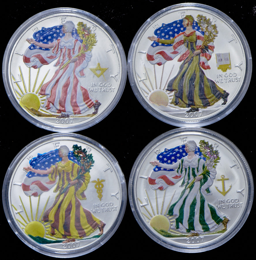 В набор "Времена года" вошли 4 серебрянных монеты 2007 года номиналом 1 доллар с цветной эмалью.