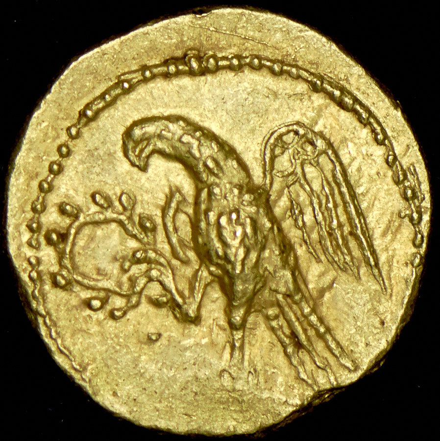 Слева изображен венок с длинными перевязями. Под обрезом греческая надпись "ΚΟΣΩΝ".