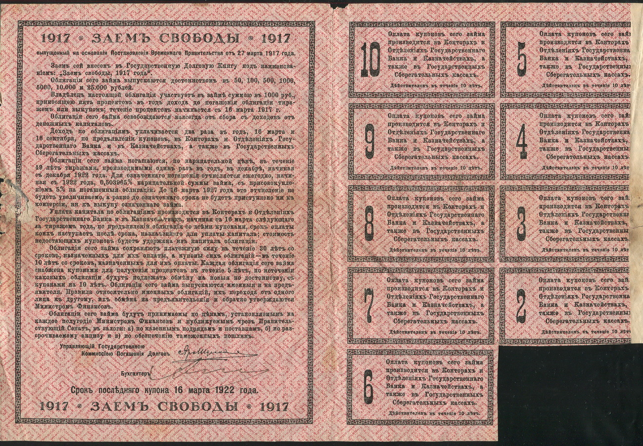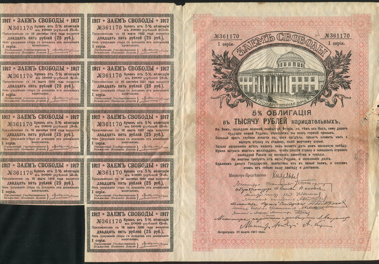 5% Облигация 1000 рублей 1917 года, I серия, №361170.