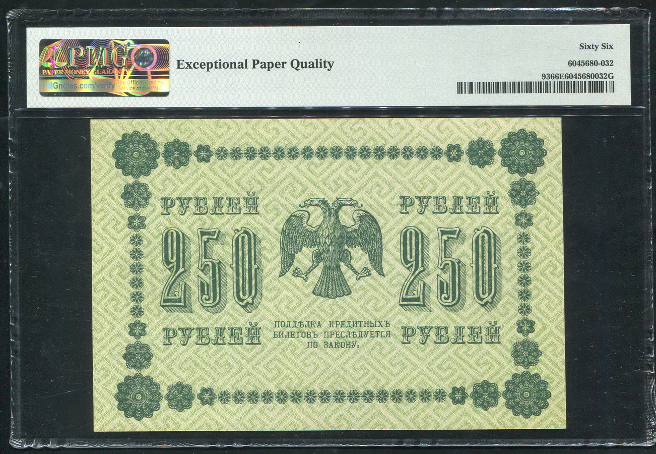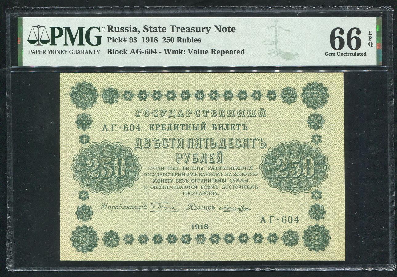 Государственный кредитный билет 250 рублей образца 1918 года, АГ-604. Кассир Лошкин. Уральская фабрика Гознака. Pick 93. В слабе PMG Gem Uncirculated 66 EPQ,