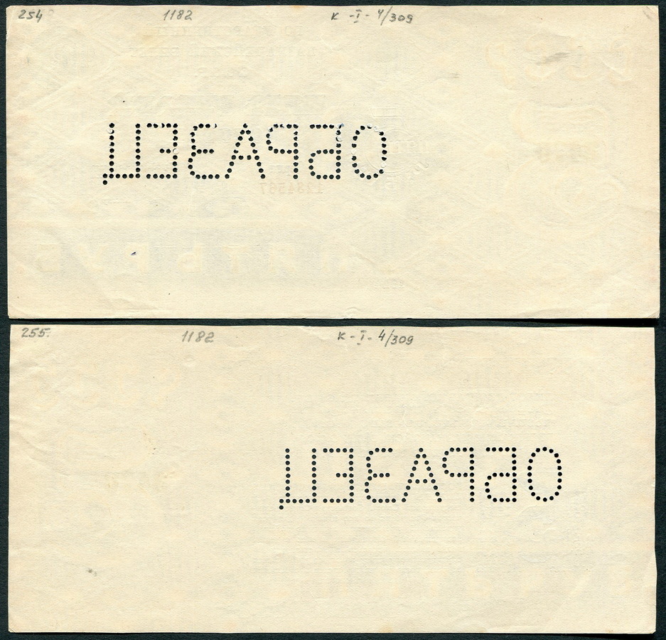 Два односторонних оттиска. На каждом оттиске, по горизонтали, нанесено перфорационными отверстиями, слово "ОБРАЗЕЦ". На белом поле оттисков чёрной типографской краской нанесены номера оттисков "3470".