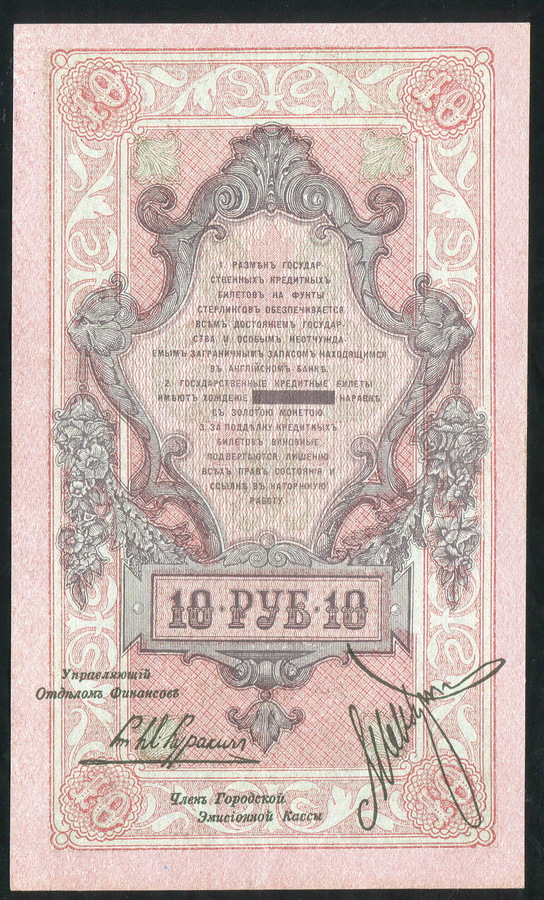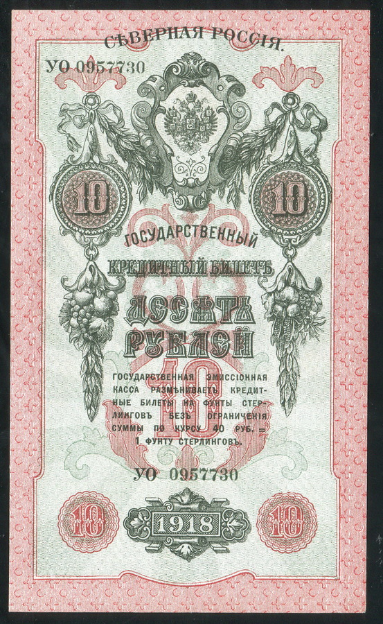 Северная Россия. Государственный Кредитный Билет 10 рублей образца 1918 года, УО 0957730.
