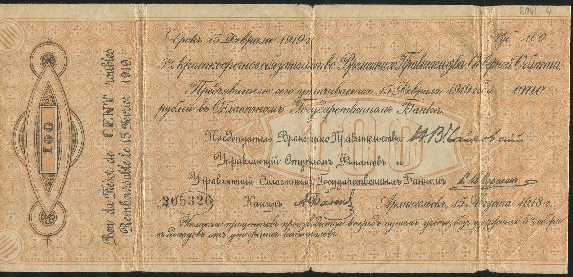 5% краткосрочное обязательство Временного правительства Северной области 100 рублей 1919 года, 205326.