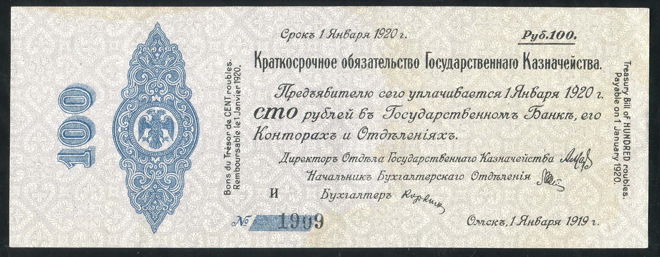 Обязательство 100 рублей 1919 (Колчак)