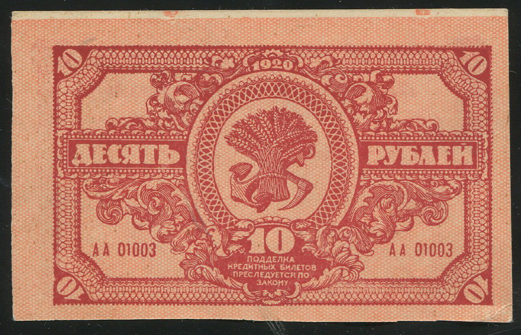 Кредитный билет Дальневосточной республики 10 рублей 1920 года, АА 01003.