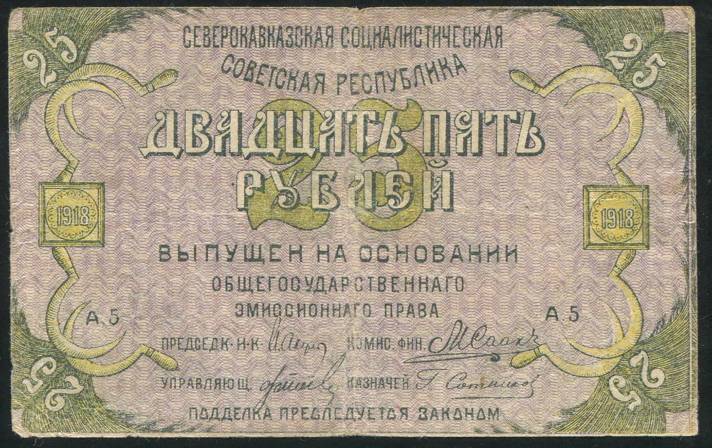 Северокавказская Социалистическая Советская Республика 25 рублей 1918 года, А 5.