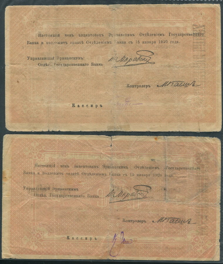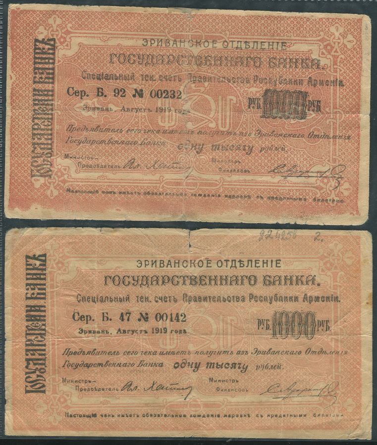 Эриванское Отделение Государственного Банка, два чека по 1000 рублей, август 1919 г.