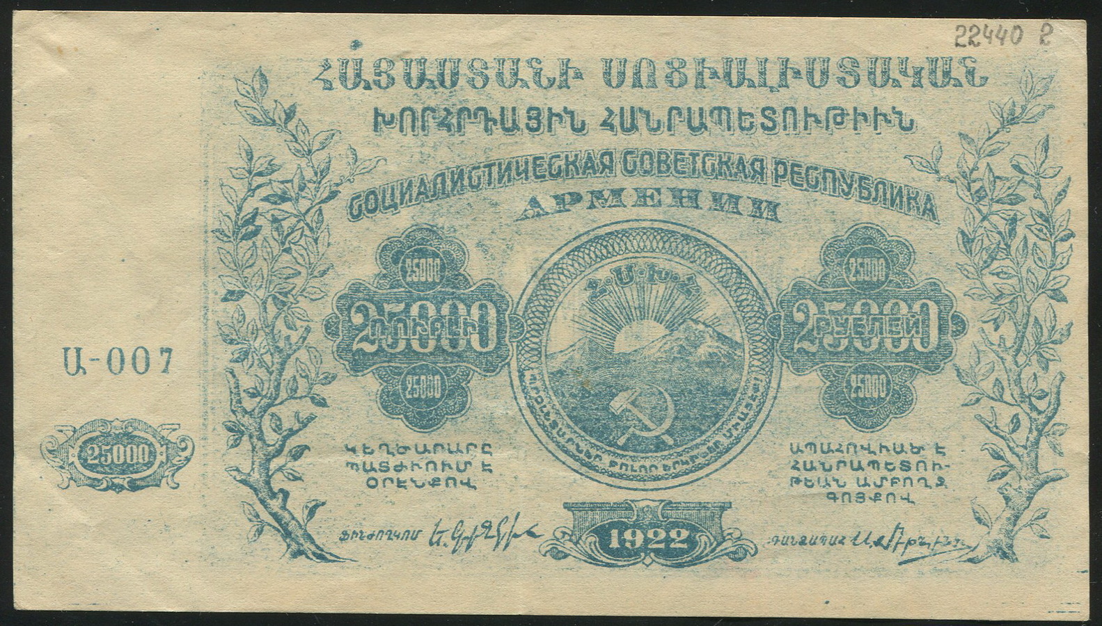 Денежный знак Социалистической советской республики Армении 25000 рублей 1922 года.