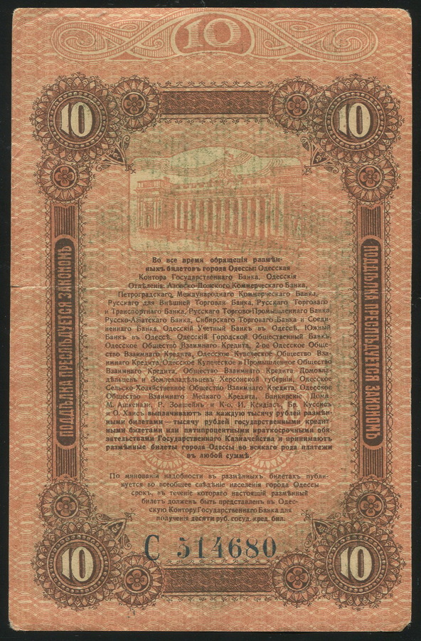 Разменный билет города Одессы 10 рублей 1917 года, С 314680.