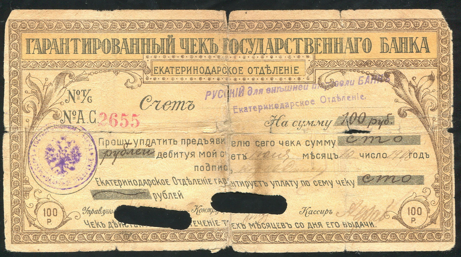 Гарантированный чек Государственного банка, Екатеринодарское отделение на 100 рублей, 21 августа 1918 года, № А.С. 2655, с оттиском печати ЕОГБ