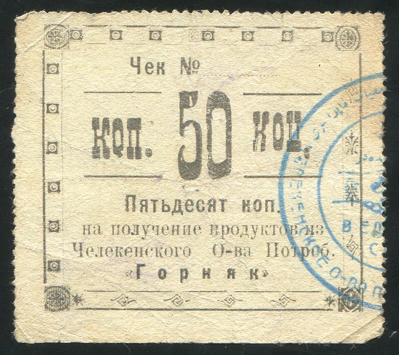 Челекенское Общество Потребителей "Горняк", Красноводская область. Чек 50 копеек (1918 года), № …, рамка "комбинированная". С оттиском печати общества.