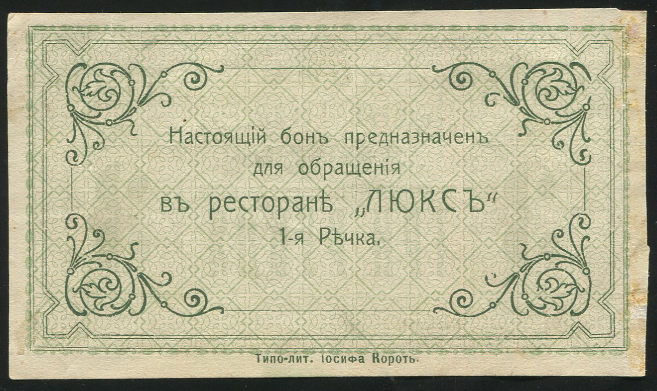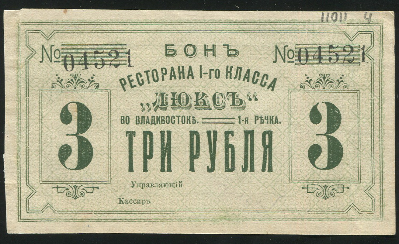 Ресторан 1-го класса "Люкс", во Владивостоке, 1-я Речка. Бона 3 рубля н/д, № 04521.
