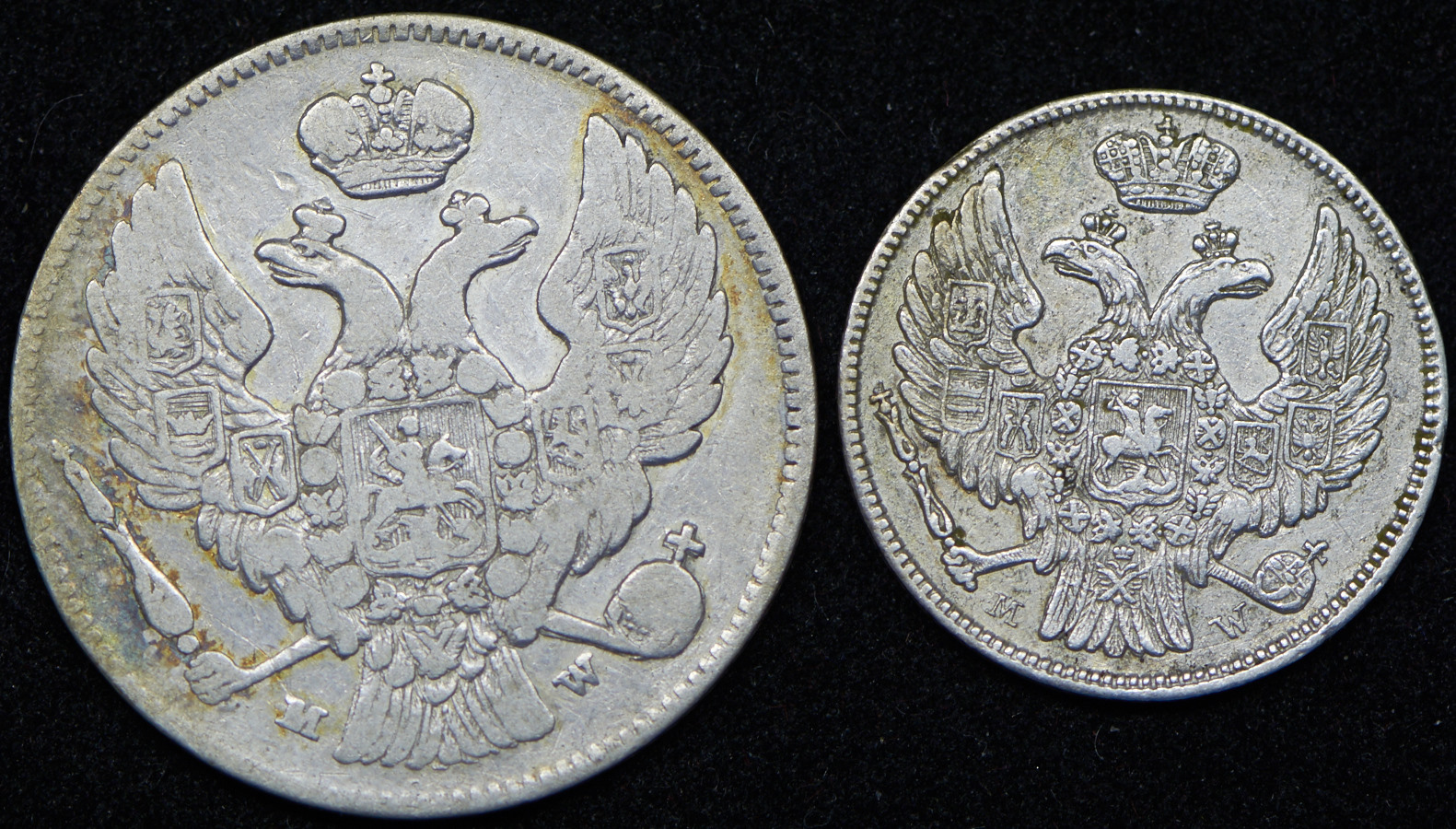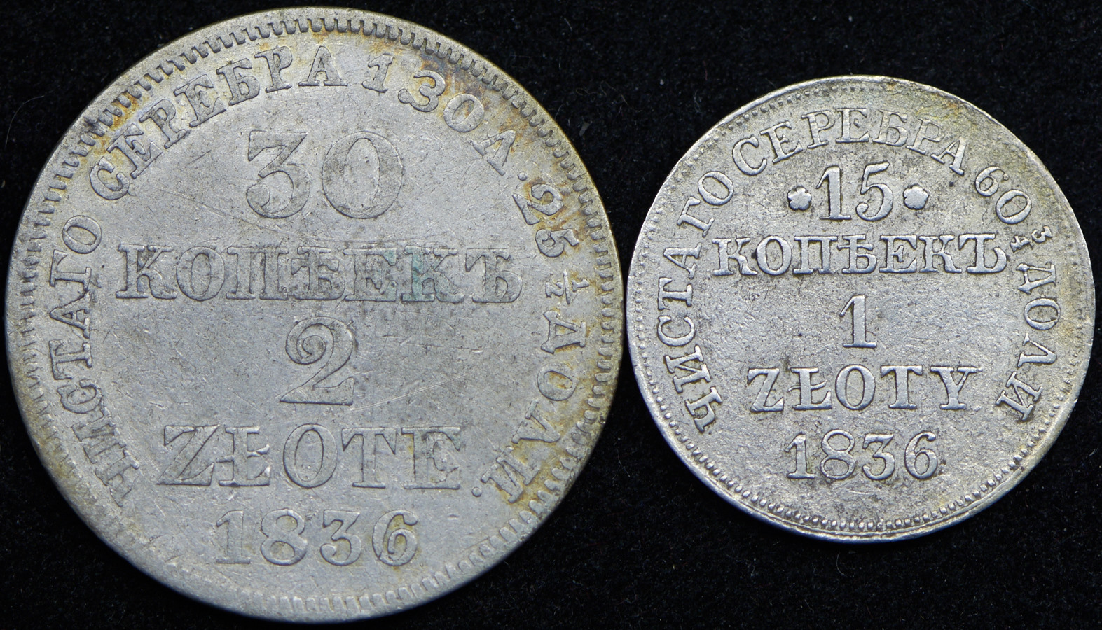 30 копеек - 2 злотых 1836, 15 копеек - 1 злотый 1836 Сохранность F- VF.
