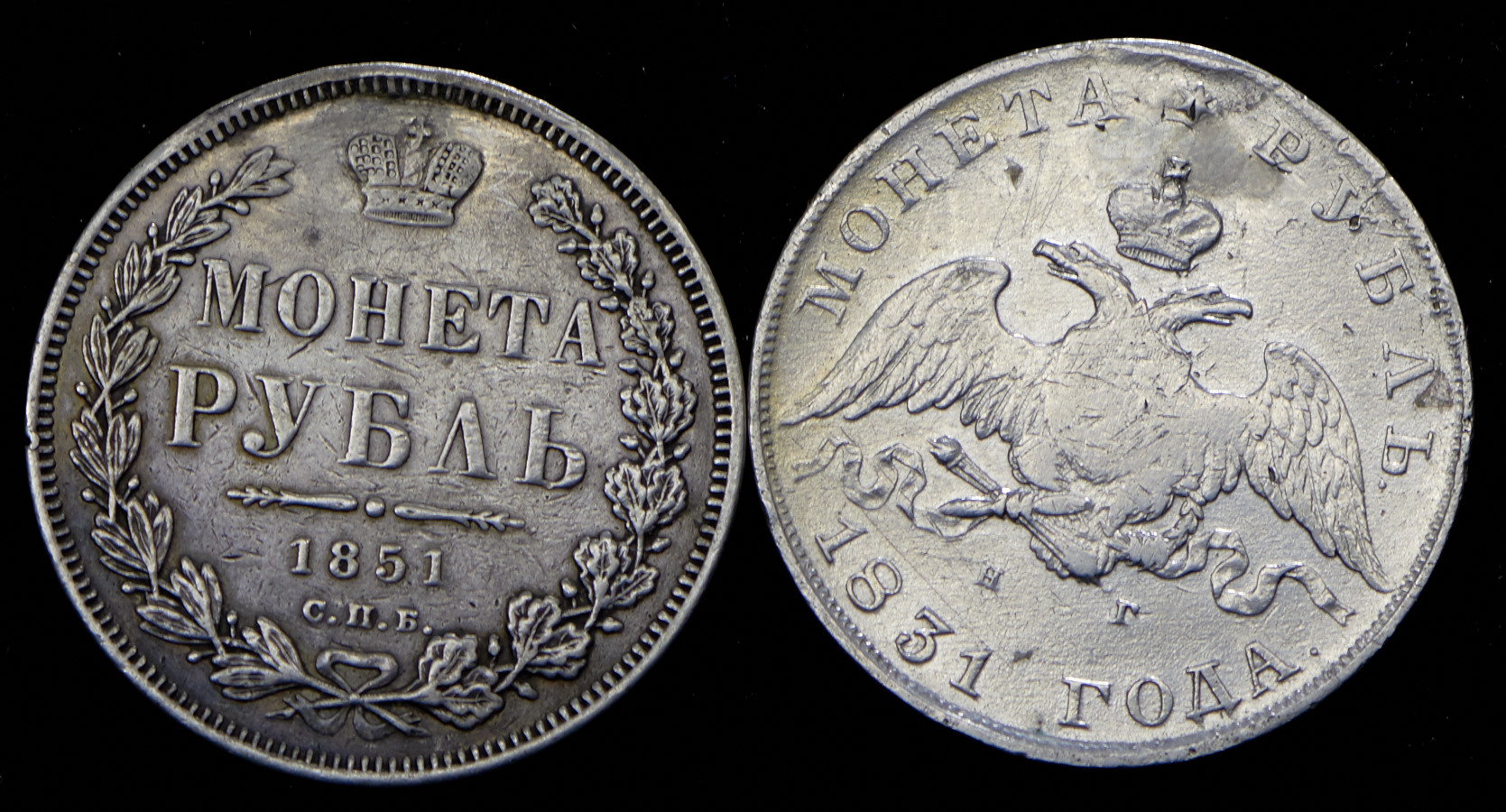 Рубль 1831 и Рубль 1851 с заделанными отверстиями.