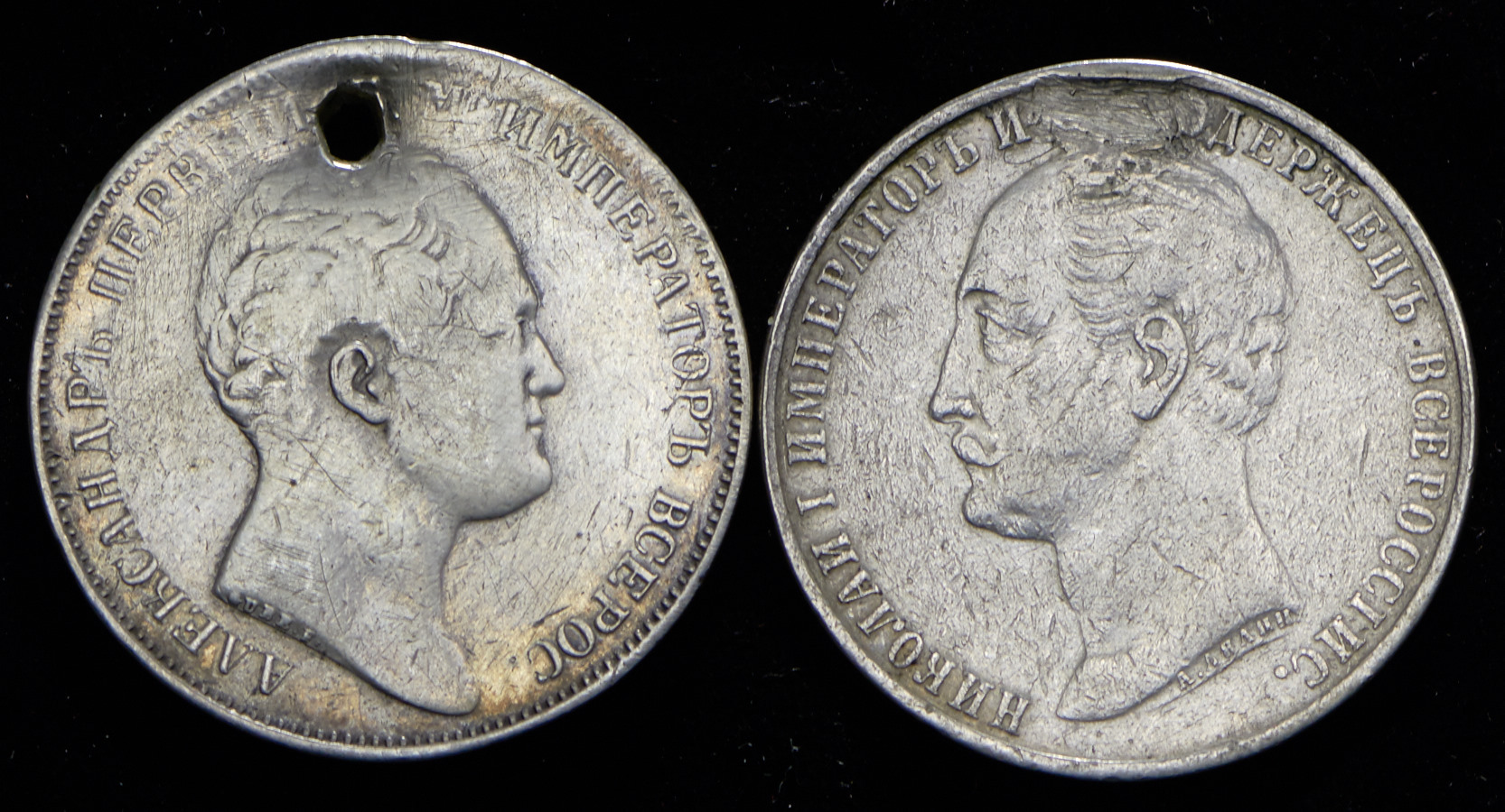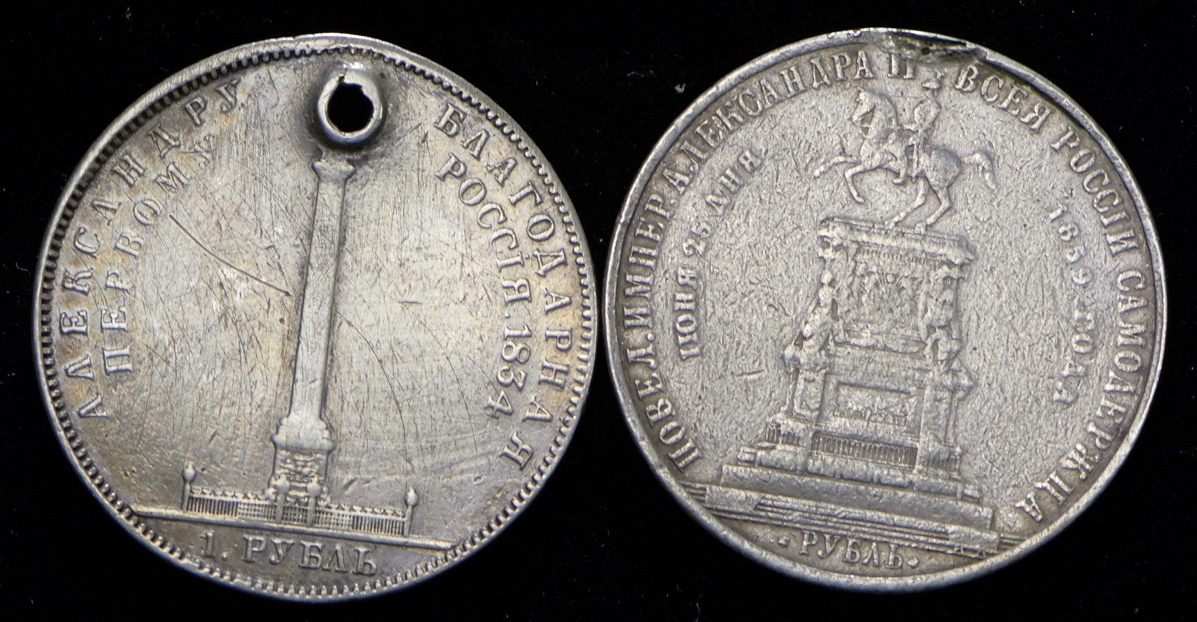 Рубль 1834 "Колонна" с отверстием и Рубль 1859 "С памятником Николаю I" со следами снятия подвеса.