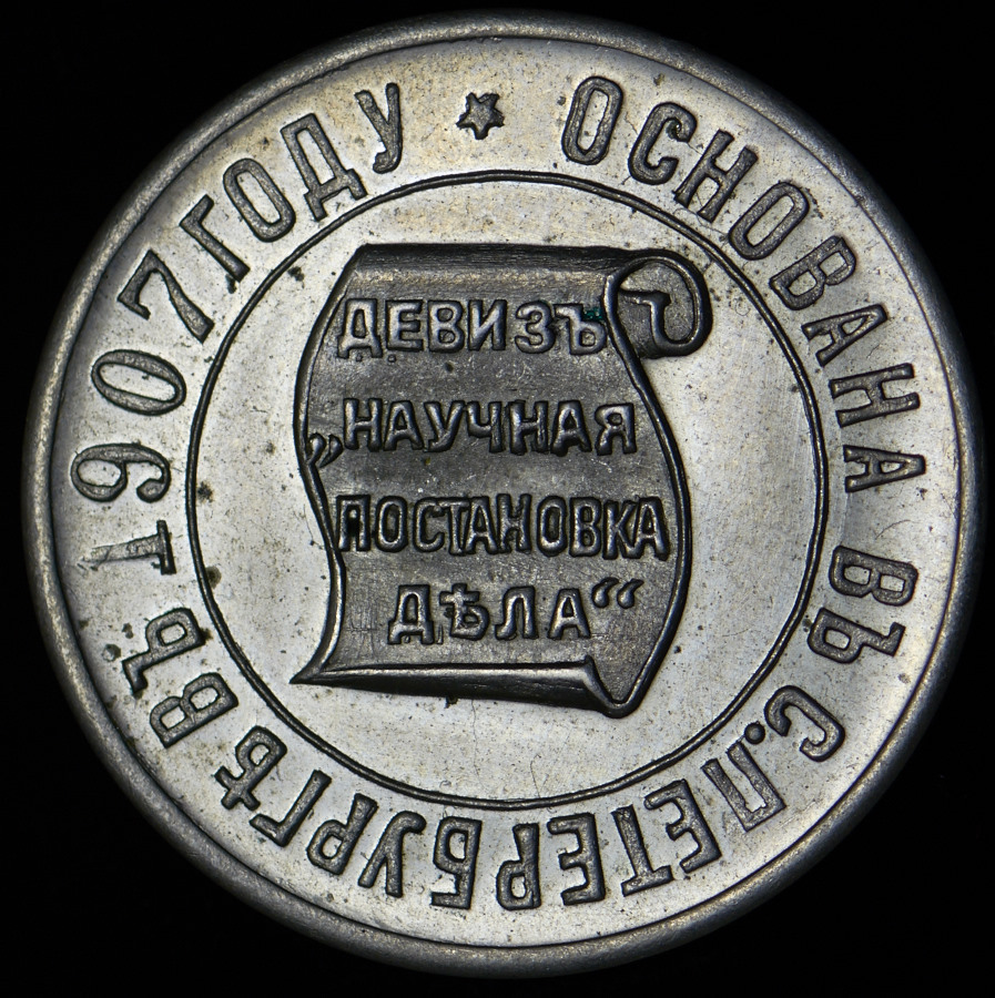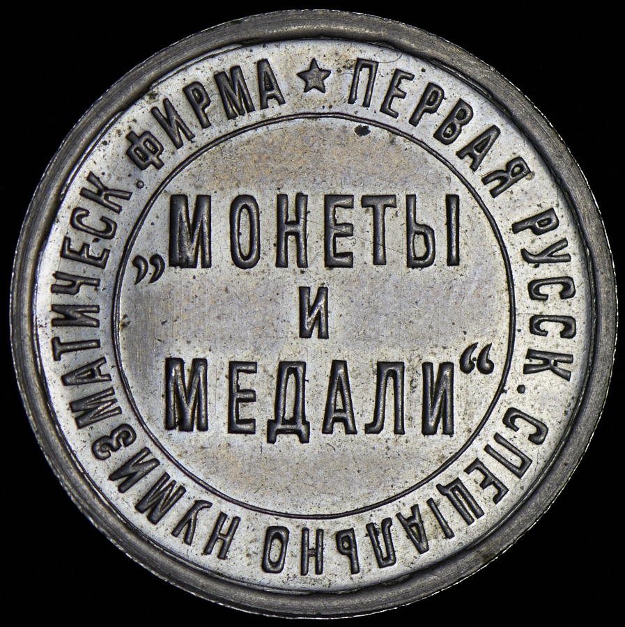 Жетон в память основания первой русской специально нумизматической фирмы "Монеты и Медали" в Санкт-Петербурге в 1907 году.