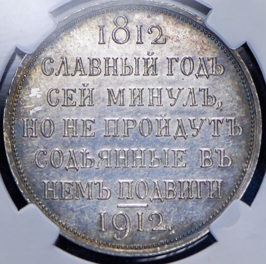 Чеканена в честь 100-летия победы в Отечественной войне 1812 года.