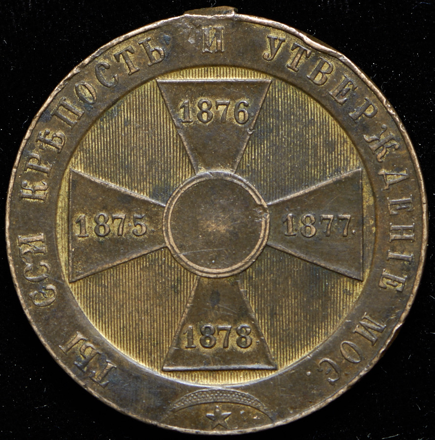 На реверсе изображение равноконечного креста с четырьмя датами на лучах креста «1875» , «1876» , «1877» , «1878», надпись по кругу «ТЬІ ЄСИ КРЬПОСТЬ И УТВЕРЖ ДЕНІЕ МОЄ»