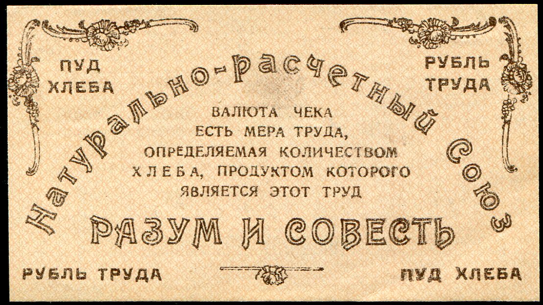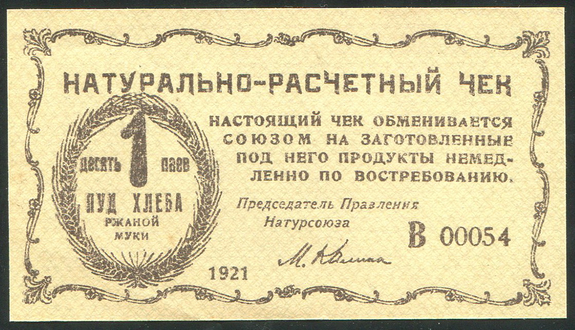 Натурально-расчетный чек на 1 пуд хлеба 1921 года, Натурально-расчетного Союза "Разум и Совесть". В 00054.