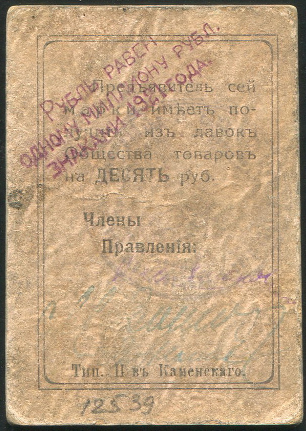 Марка 10 рублей Первого Кизеловского Общества Потребителей на картоне. С надпечаткой "Десять миллионов рублей 10.000.000".