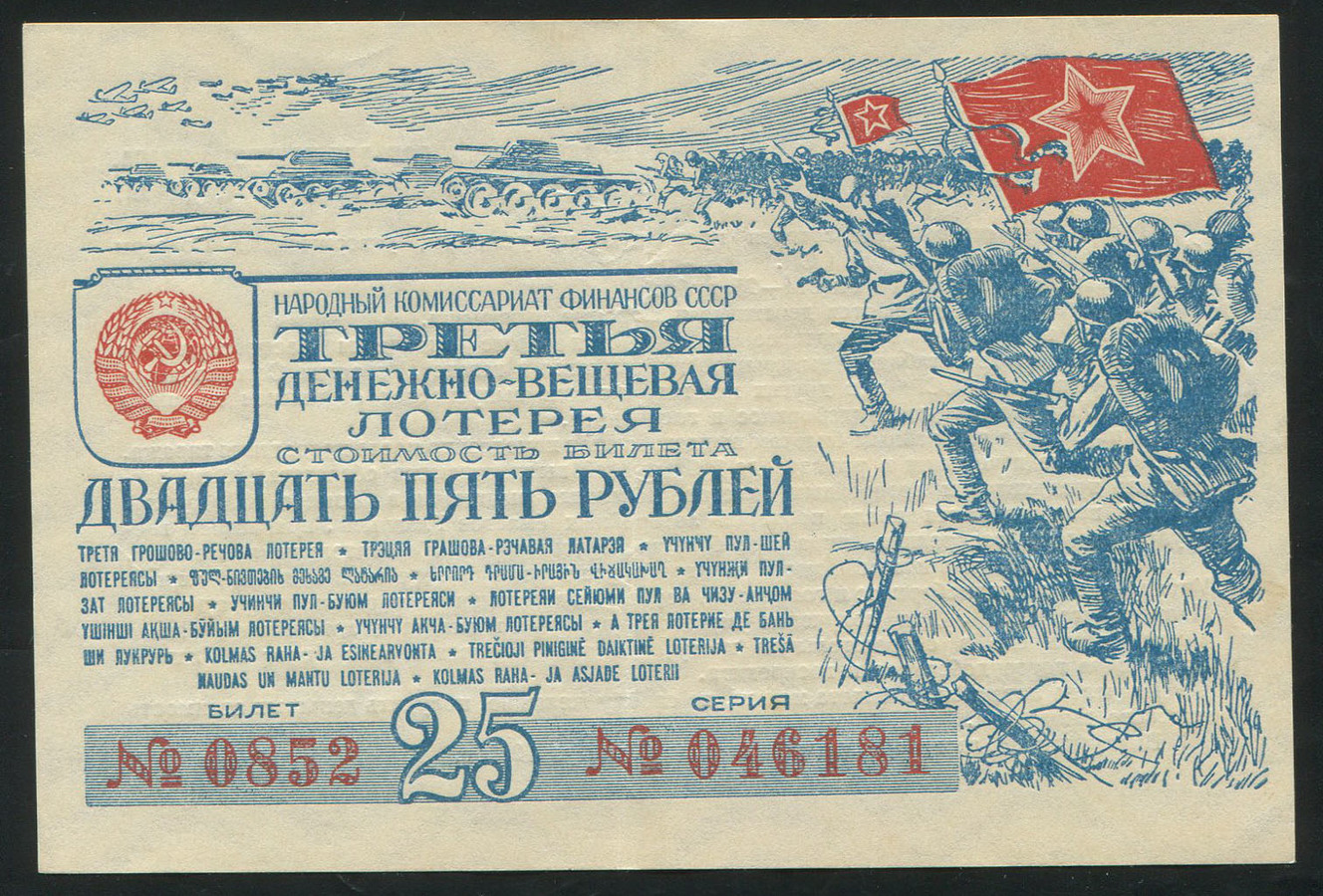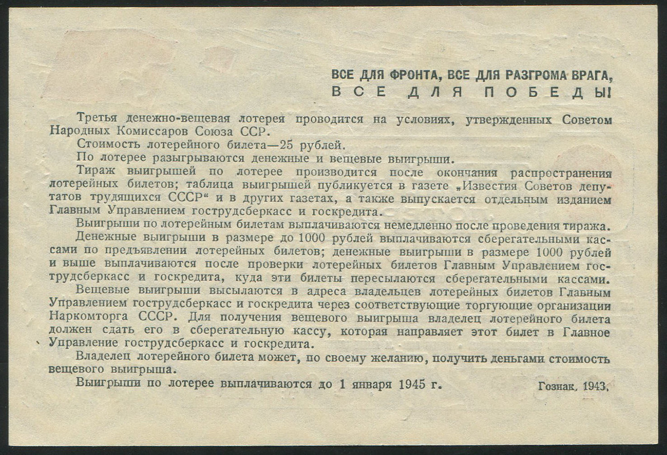 Билет "Третья денежно-вещевая лотерея" 25 рублей 1944